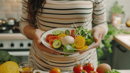 An AI generated illustration of a female holding a bowl of vegetables and burrata