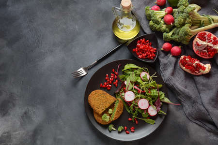 Broccoli schnitzel served with pomegranate salad. Healthy vegan food .