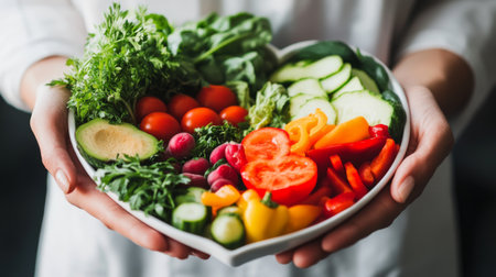 Nutritionist with a heart-shaped dish of assorted vegetables, encouraging healthy eating habits with this inviting photo.
