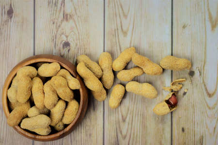 Peanuts in shells on wood background