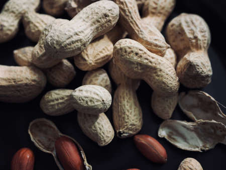 Raw unshelled peanuts in the shell. Organic groundnut. Black background. The view from the top.