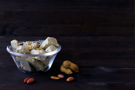 pieces of halwa from sunflower seeds with peanut in the glass bowl. national traditional sweetness of Turkish and arabic halva on the black table. tasty dessert with copy space.