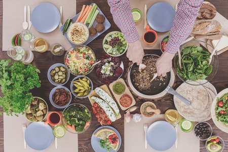 cropped view of photographers making food composition for commercial photography on smartphone, panoramic shot