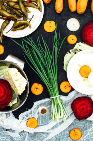 Onion, beet, pepper, garlic, carrot, cabbage ready to prepare salad. Detox and diet food. Composition of organic veggies. Vegetable food background. Red and green veggies composition on a black table
