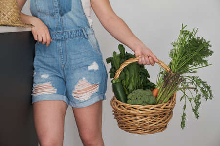 Unrecognizable farmer holding fresh vegetables basket picked in the garden. Proximity vegetable purchase concept.