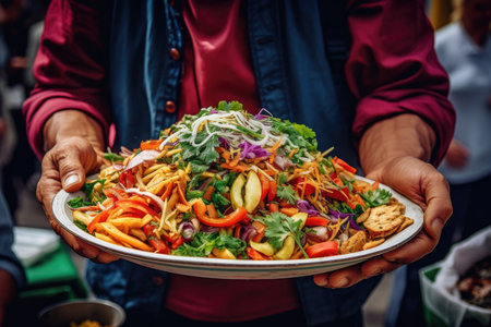 A person holding a plate of salad with vegetables and meats. They are waiting to eat the food.. Generative Ai