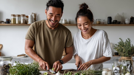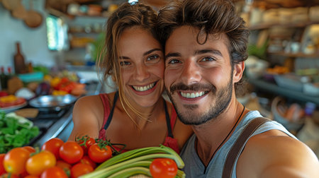 In their home kitchen, a young couple was posing for a selfie while chopping vegetables. They appeared content and were grinning together.