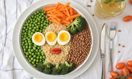 A fun, minimalist dinner plate featuring a mosaic of peas, carrots, lentils, rice, and sweetcorn forming a human face. Egg