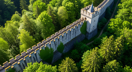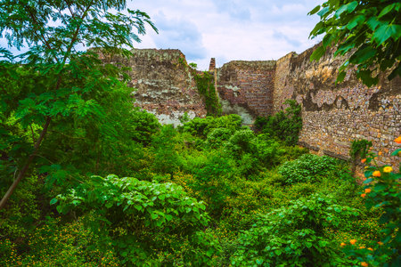 Ancient ivy-covered castle ruins surrounded by lush greenery. Concept of historical architecture, medieval structures, overgrown nature reclaiming man-made structures. Scenic landscape, historical landmark.
