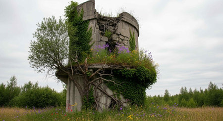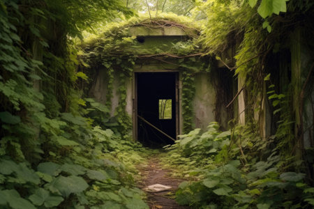overgrown entrance to an abandoned military bunker, created with generative ai