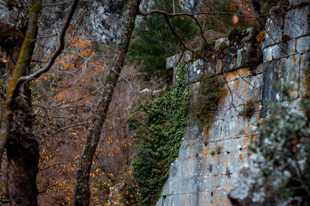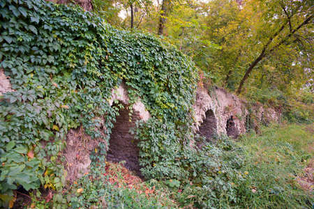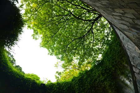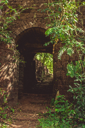 Old stone tunnel with ivy on the wall and green leaves in the background