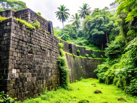 Ancient fortress wall in the jungle. Stone wall of an ancient fortress. Antique building