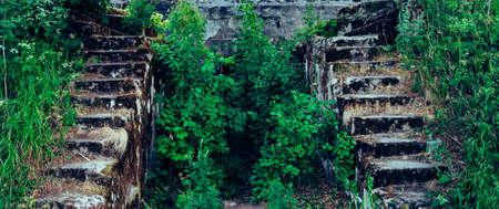 Stone staircase in the forest. Old Fort. Symmetry. Vintage War