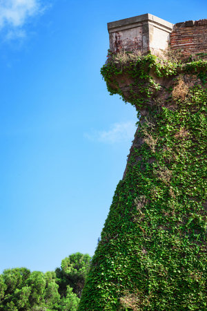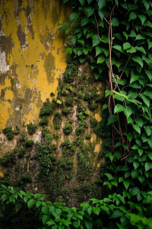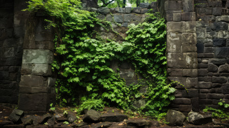 top segment of a fallen wall overgrown with plants, created with generative ai