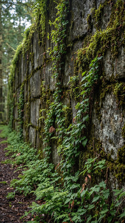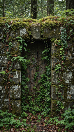A weathered stone facade is overtaken by lush green ivy, framed by blurred leaves, conveying a sense of timelessness and the enduring power of nature reclaiming history.