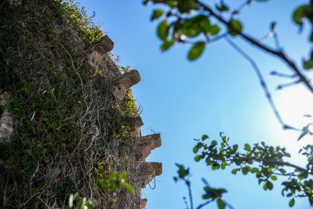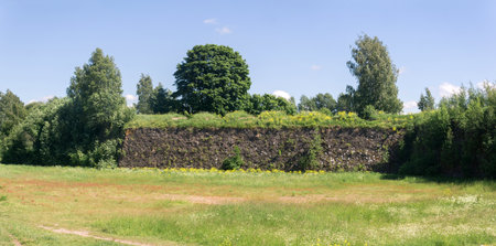 sunny landscape with stone wall among grass, ruins of ancient fortifications