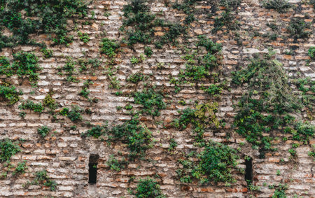 Ancient Brick Wall in Rome with Trees, Greenery Growing Through Weathered Stone