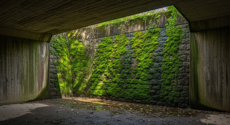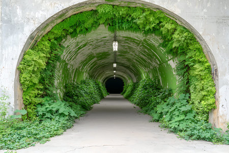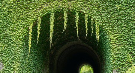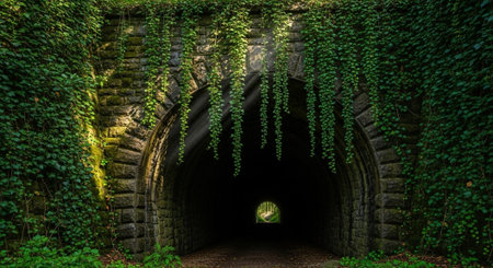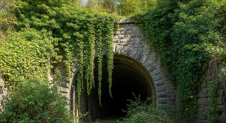 Explore a serene tunnel entrance enveloped by lush greenery, inviting discovery through its mysterious path. Ideal for nature lovers and adventure seekers.