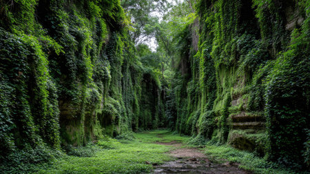 Explore a tranquil green canyon filled with vibrant foliage and lush plants. This serene landscape invites adventurers to connect with nature in an untouched wilderness.