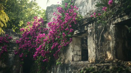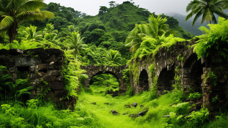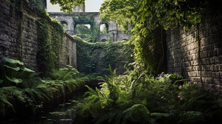 This image captures an enchanting view of overgrown ruins, where lush greenery embraces the weathered stone structure, showcasing nature's reclaiming power in a tranquil setting.
