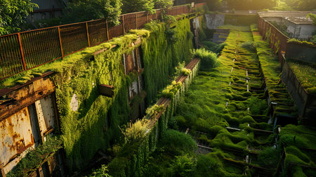 Moss-covered walls, rusted fences, overgrown gardens, nature reclaiming urban spaces in human absence Photography, golden hour casting a warm glow over the scene, Vignette effect, Aerial view