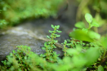 Small plants on moss. Small green leaves with water drops.