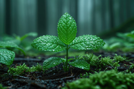 Macro shot of vibrant green seedlings emerging from a bed of lush moss, adorned with delicate water droplets, set against a soft, blurred green background.