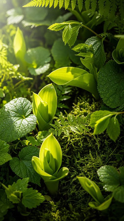 Captivating close-up of lush green foliage on the forest floor, illuminated by soft light, creating a serene and tranquil atmosphere perfect for nature-themed projects.