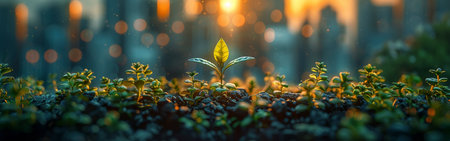 In this close-up view, small green plants are visibly sprouting out of the brown soil, indicating growth and new life. The delicate stems and leaves are reaching towards the sunlight, showcasing the resilience and beauty of nature.