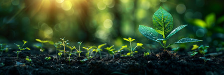The seedling are growing from the rich soil to the morning sunlight that is shining, ecology concept.