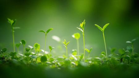 Delicate showing close-up macro view of young green seedlings emerging from rich soil with soft bokeh background and gentle sunlight illuminating delicate new...
