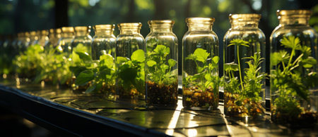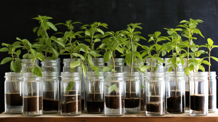 This image showcases a delightful array of young plants growing in glass jars, beautifully arranged on a wooden table. Surrounded by a fresh natural background, these vibrant green specimens represent the beauty of growth and nurturing in a sustainable environment.