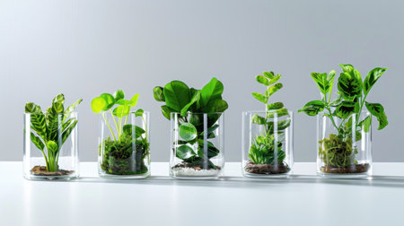 Assortment of vibrant green plants in glass cylinders against a soft purple backdrop. A diverse collection of flora, perfect for nature or botany themes.