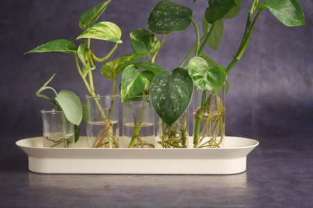 Various green plants are displayed inside clear glass tubes, showcasing visible root systems. The plants are arranged on a table in front of a blurred window, bathed in bright, natural light. This composition provides a clean, modern aesthetic suitable for a range of commercial and editorial uses.