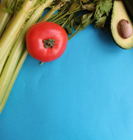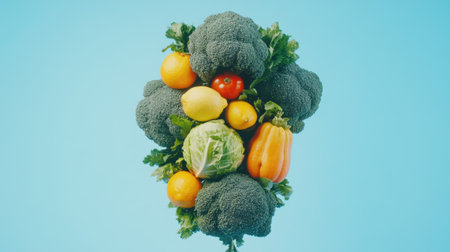 A cluster of fresh vegetables and fruits on a blue background.