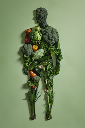 Creative Arrangement of Fresh Vegetables Forming a Human Shape on a Dark Background