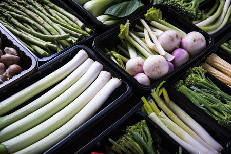 Fresh vegetables in plastic trays, from above