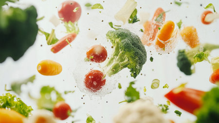 Fresh vegetables in motion: broccoli, tomatoes, and carrots in midair explosion.