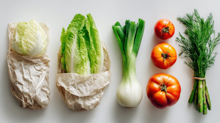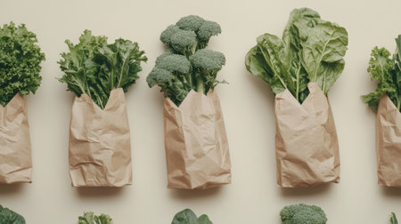 A vibrant display of fresh vegetables such as lettuce and broccoli, wrapped in eco-friendly packaging, promoting healthy eating and sustainability in daily meals.