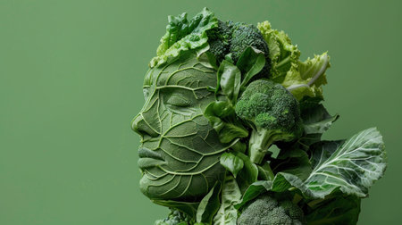 Creative composition featuring a face made of various green vegetables, showcasing the concept of health and nutrition with a fresh and vibrant green background.