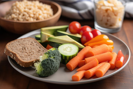 plate of veggies, cheese, and slice of whole-wheat bread, created with generative ai