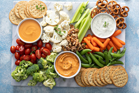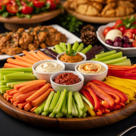 A vibrant display of fresh vegetables, dips, and nuts perfect for health-conscious snackers and entertaining at gatherings. Bright colors and textures invite delicious enjoyment.