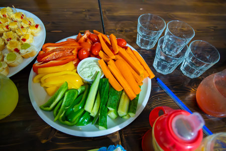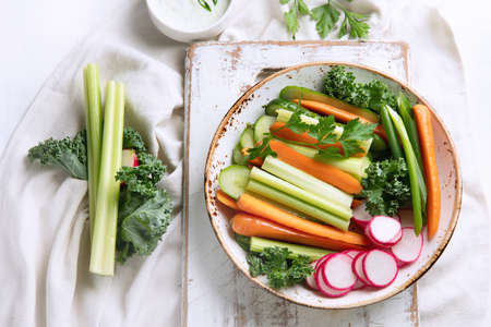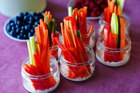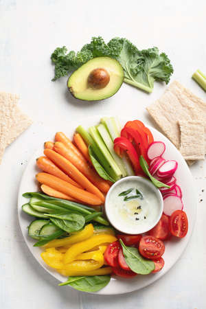 Healthy snacks. Fresh vegetables with sauce. Top view