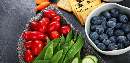A vibrant snack platter featuring assorted berries, nuts, fresh fruits, and crisp vegetables, beautifully arranged on a marble surface, ideal for promoting healthy eating.