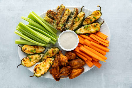 Top down view of an appetizer platter filled with homemade baked appetizers and crispy cold celery and carrots sticks.