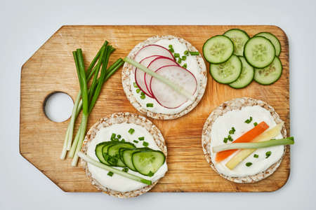 delicious sandwiches with fresh herbs and soft cheese on a white background. Healthy food concept photo with copy space