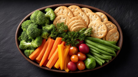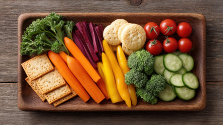 A vibrant assortment of fresh vegetables and crunchy crackers, beautifully arranged on a wooden platter, ideal for health-conscious snacking or entertaining guests.