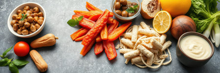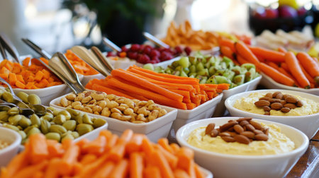 A vibrant table filled with an assortment of healthy snacks, featuring fresh carrot sticks, nuts, and delicious dips. Perfect for gatherings and wellness events.