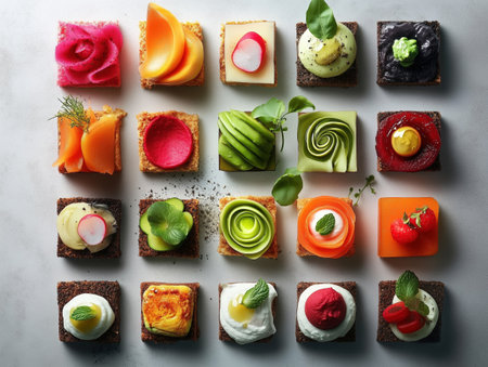 A geometric composition of protein snacks meticulously arranged following the golden ratio on a clean table. Each snack is a unique square or round piece, featuring toppings like creamy avocado, vibrant beet mousse, yogurt with honey, and spiced hummus