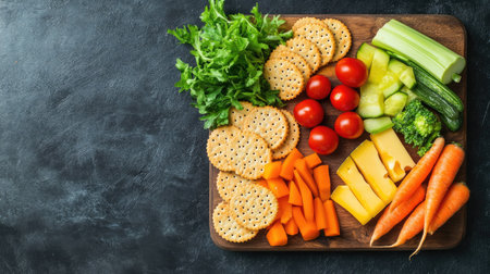 Top view of a wholesome snack board with cheese, crackers, and vegetables for kids, arranged neatly with copy space